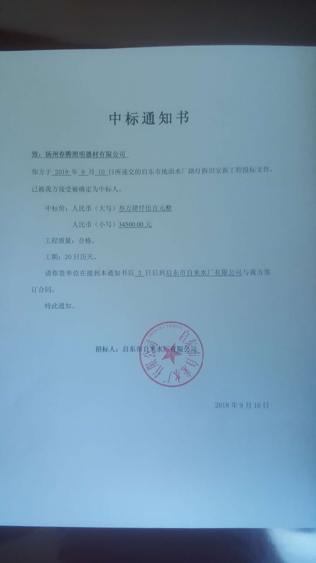 启东市地面水厂路灯拆旧安装工程中标通知书