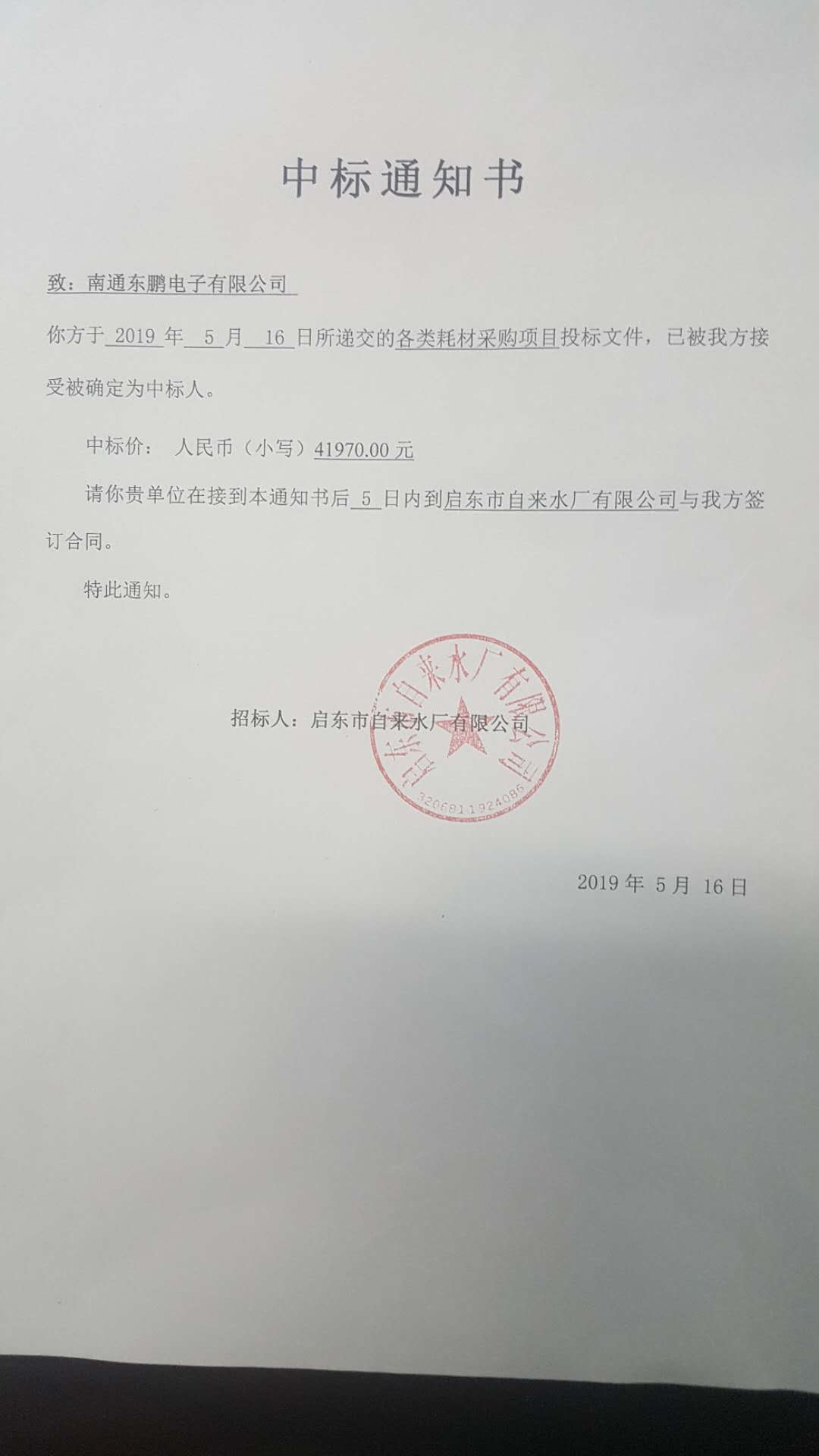 启东市自来水厂有限公司各类耗材采购项目中标通知书